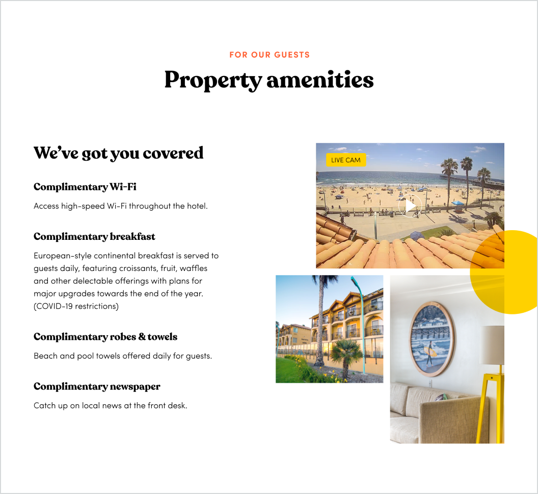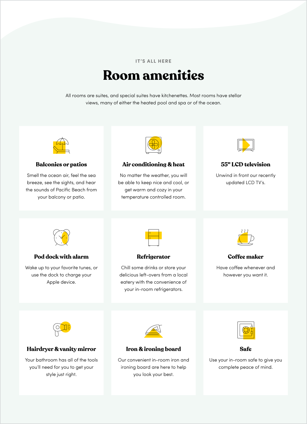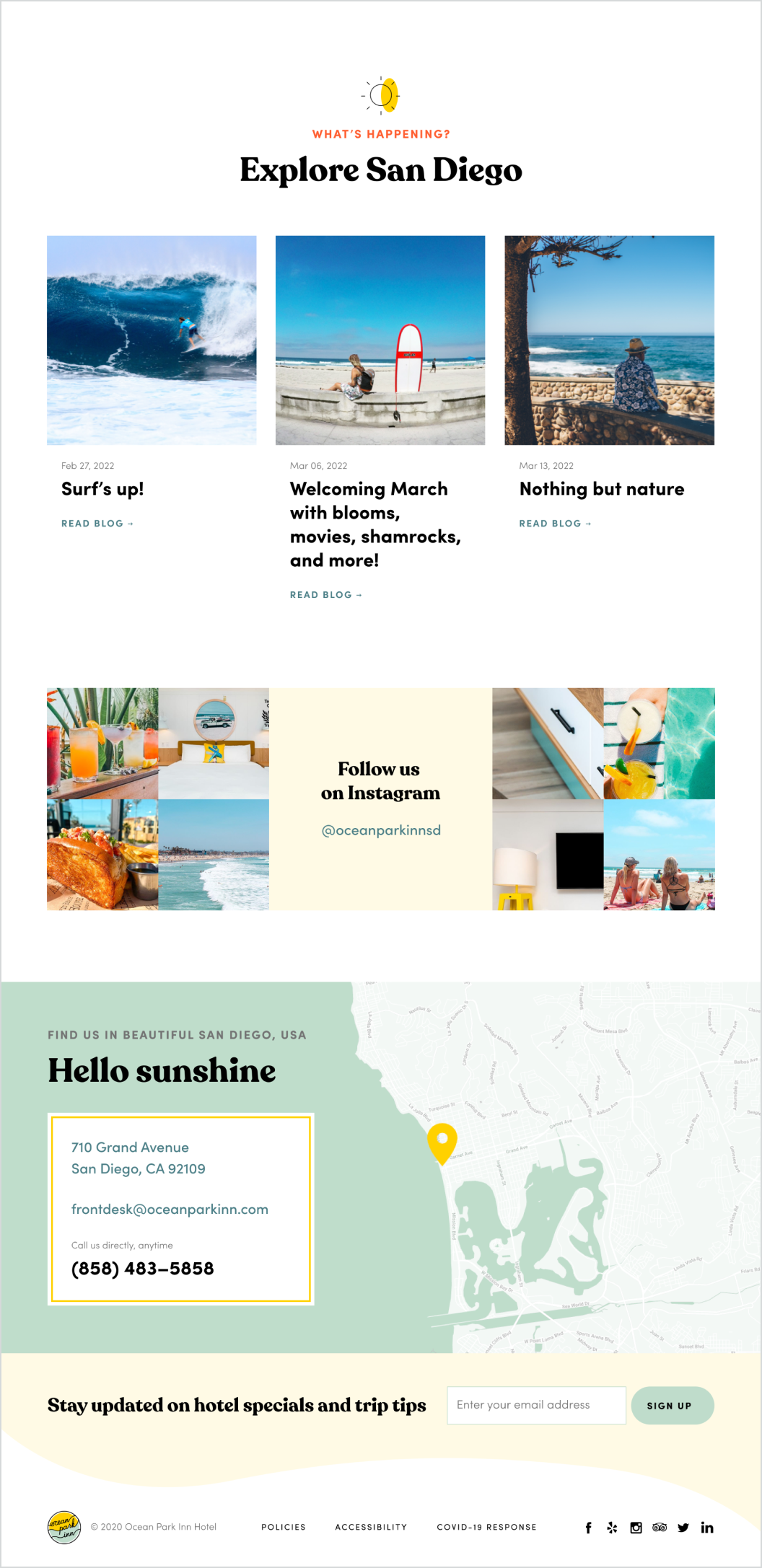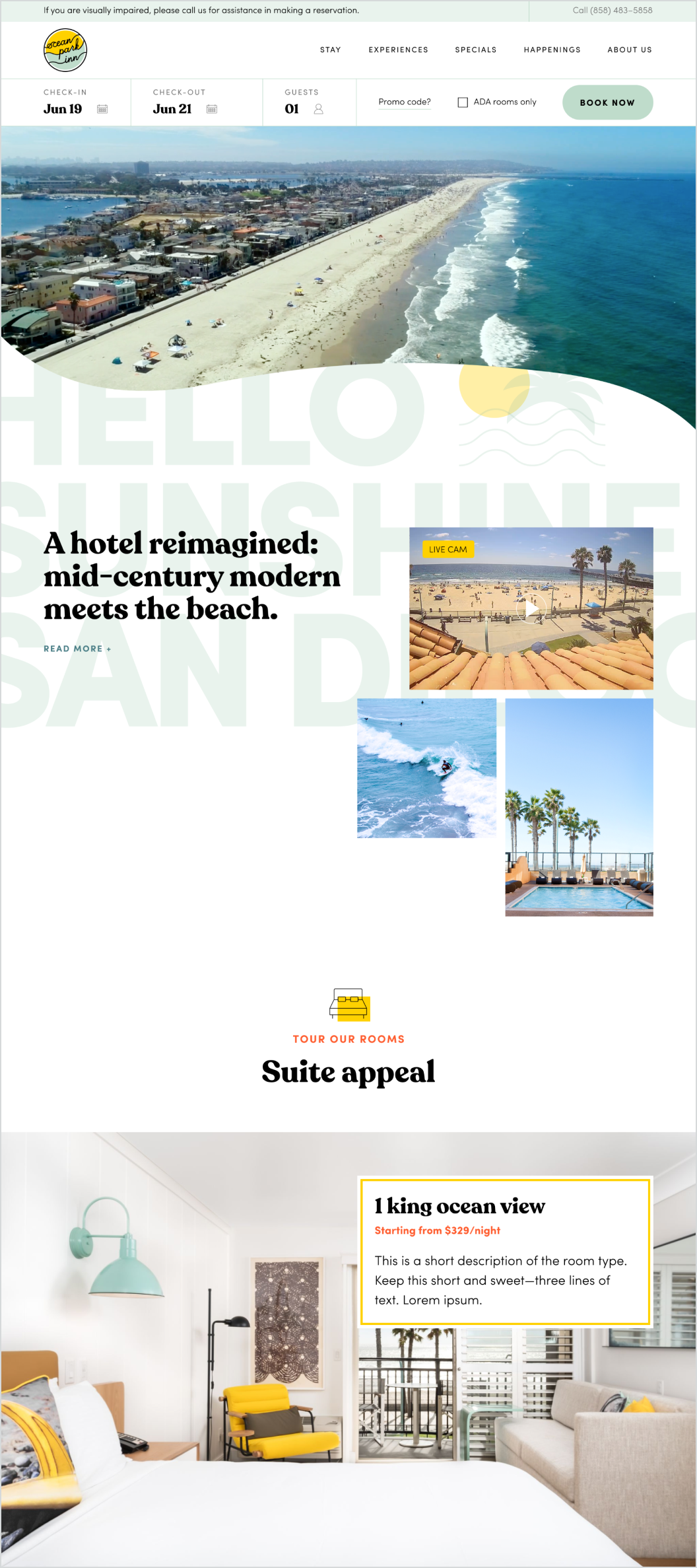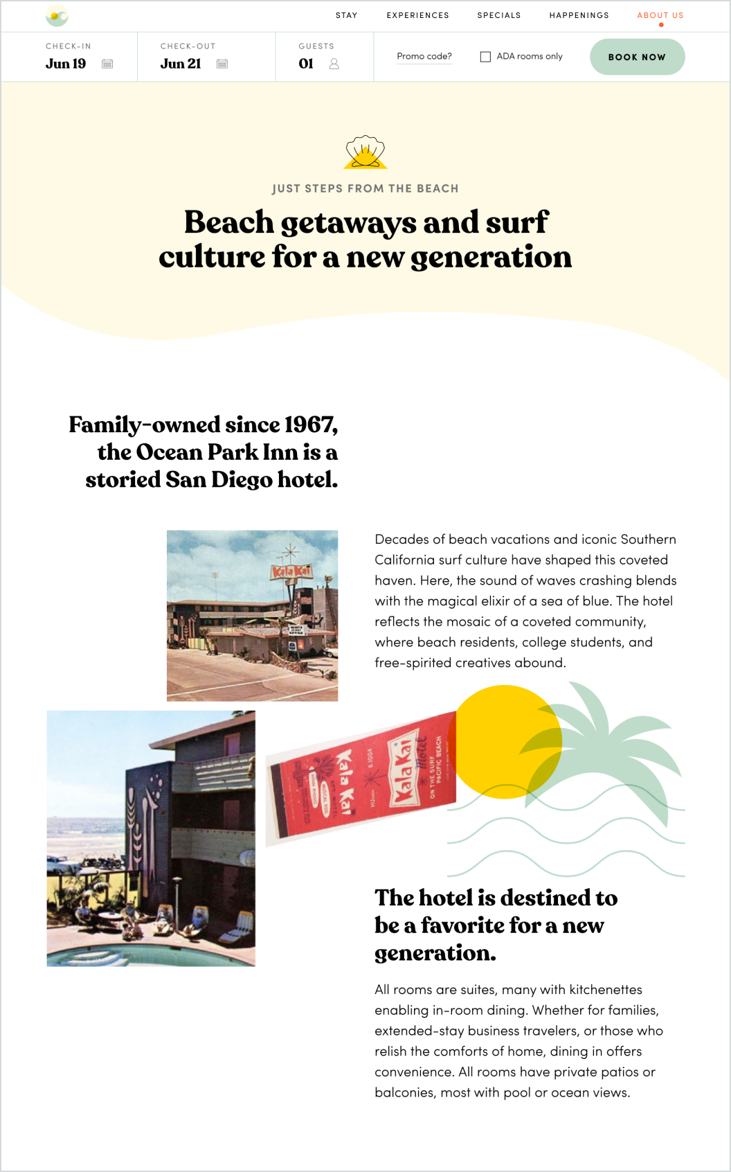 After cross-team approval on the IA, we moved into applying the refreshed brand to the defined pages. The goals for this project were clear: showcase Ocean Park Inn as a San Diego cultural staple, promote the San Diego beaches as incredible tourism destinations, and of course encourage travelers to book rooms.